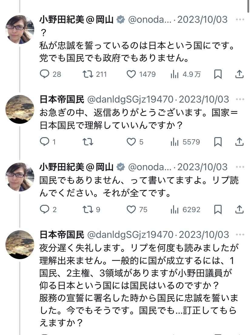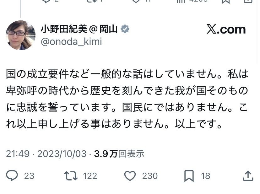 自民党小野田「私は卑弥呼の時代から歴史を刻んできた我が国そのものに忠誠を誓っています。国民にではありません」