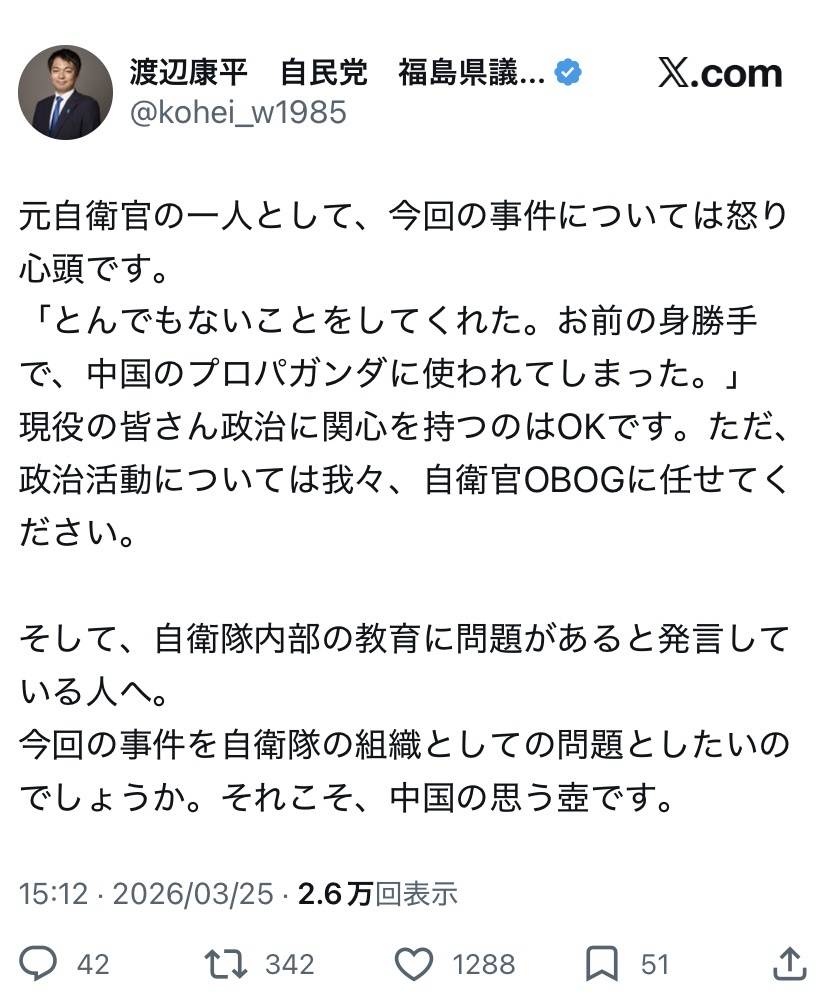 - 元自衛官の政治家として問題をそこに置くこういう反応が中国の「プロパガンダ」の思う壺だろ🤣