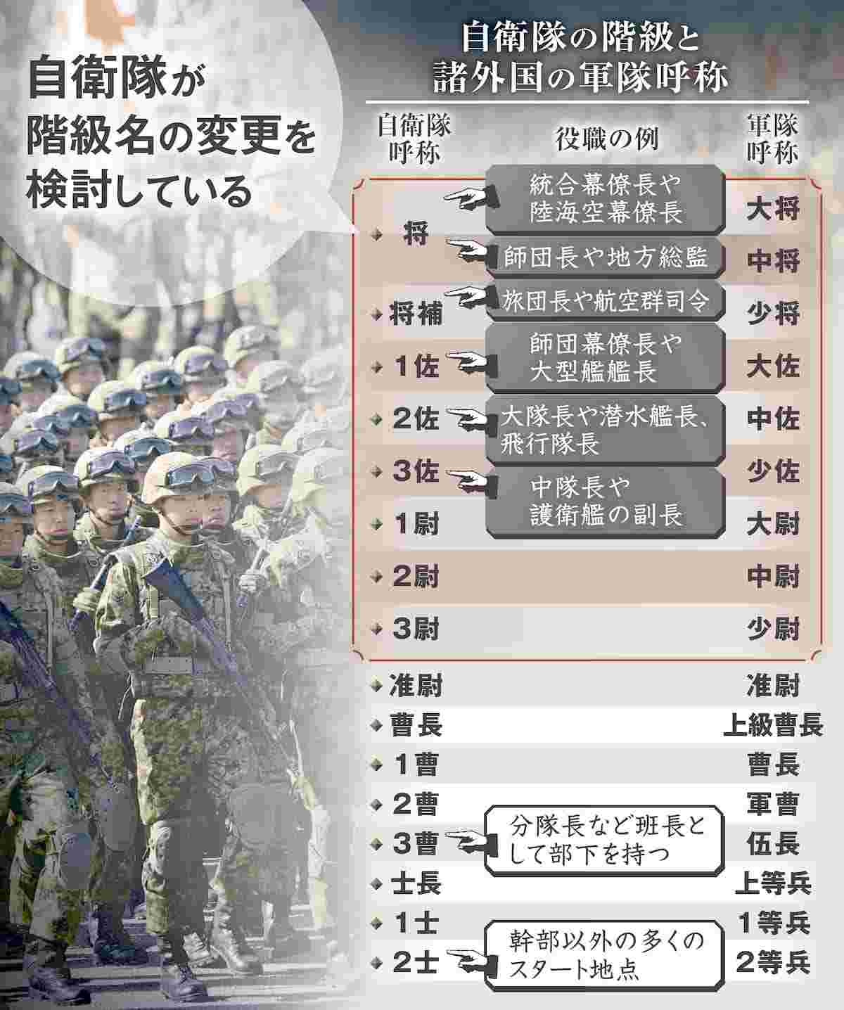 ただ、防衛省では「すでに現在の名称は定着している」として変更に否定的な声もある。階級や職種の名称変更は過去にも政府・与党内で検討された。