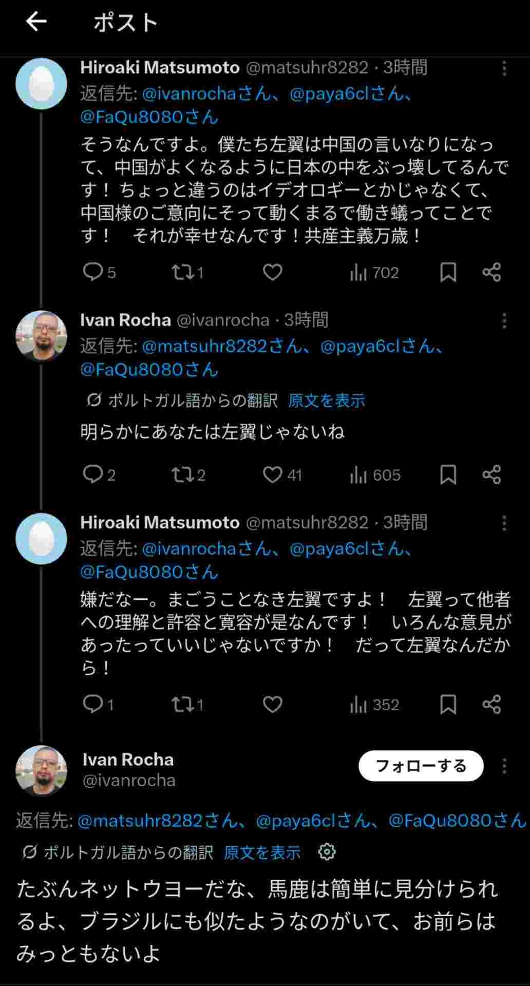 - ネトウヨ さん、ブラジル人相手にパヨク成りすまし芸を披露するも呆れられて終わる