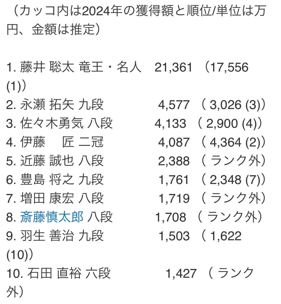 - それ以上に他の収入でかいやろな藤井聡太クラスなら