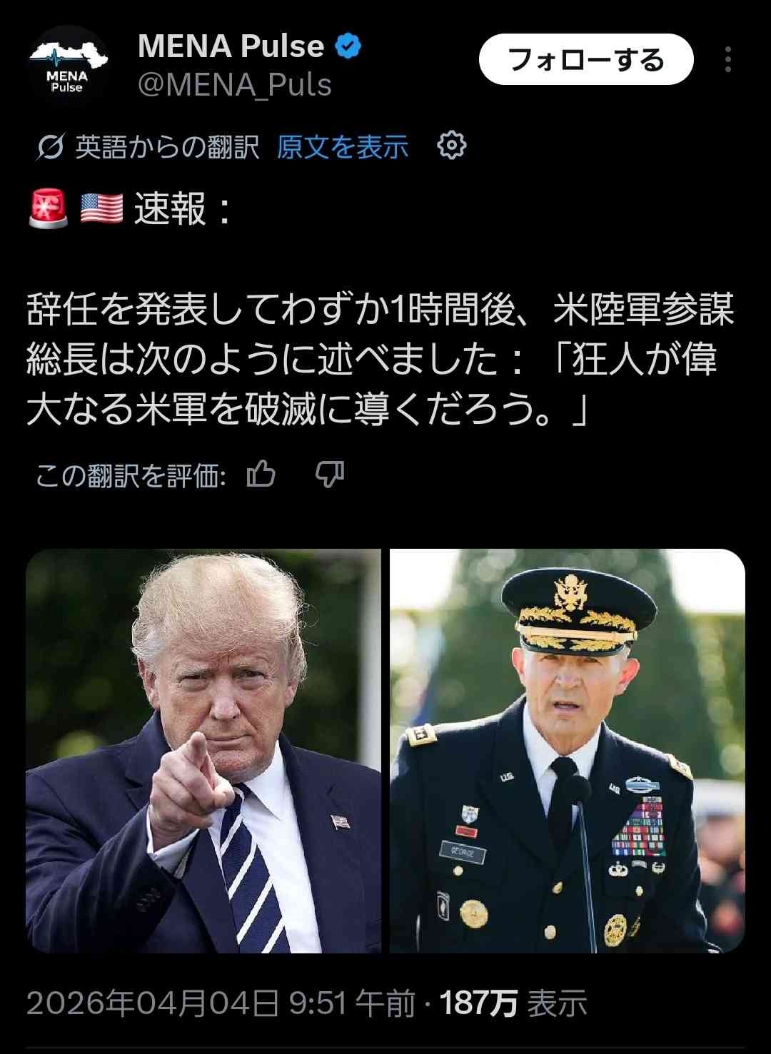 辞任した米陸軍トップ、コメントを発表「狂人が偉大な米軍を破滅に導くだろう」😔