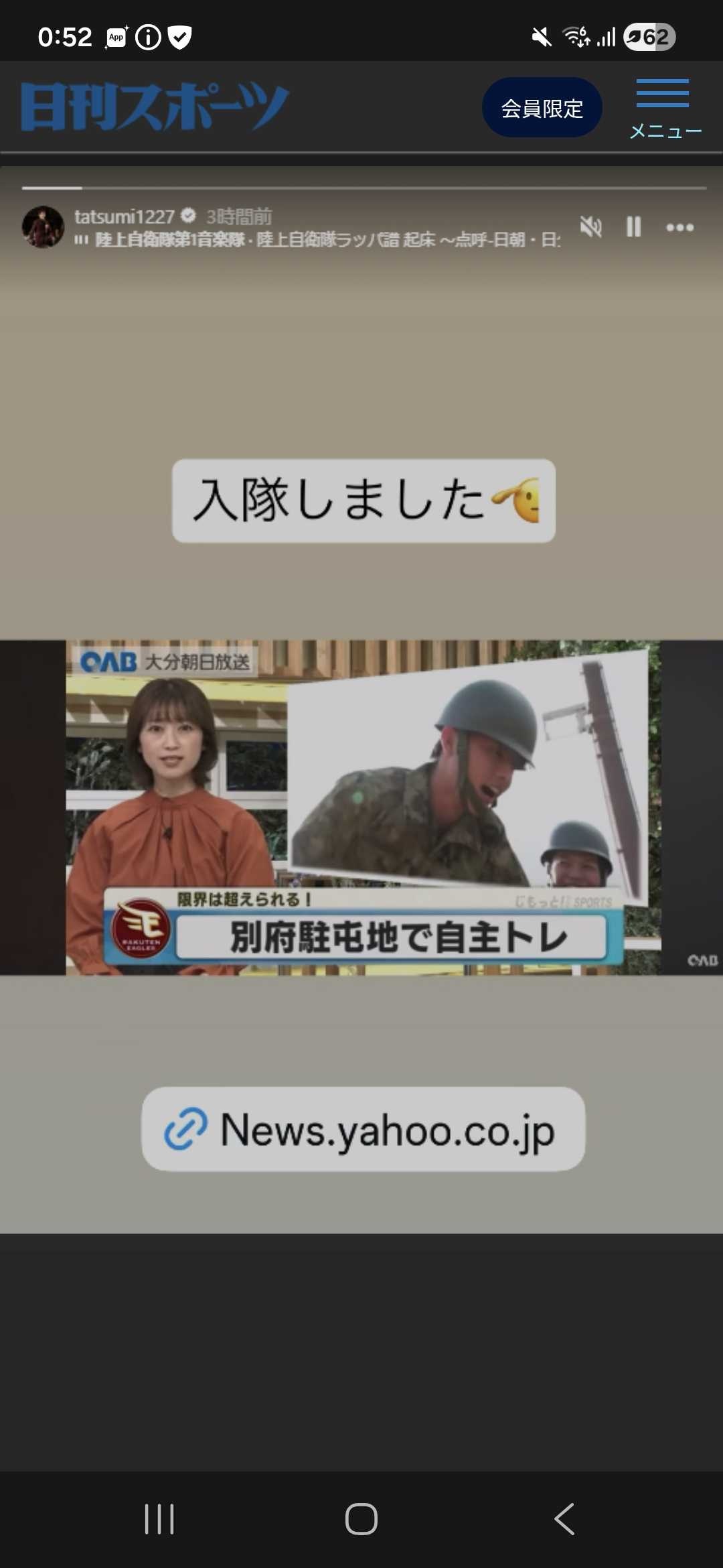 17日、インスタグラムのストーリーズを更新。大分の陸上自衛隊別府駐屯地でチームメートの古賀康誠投手(21)とともに自主トレに励んでいるといい、地元テレビ局に取材された動画とともに「入隊しました」とつづった。