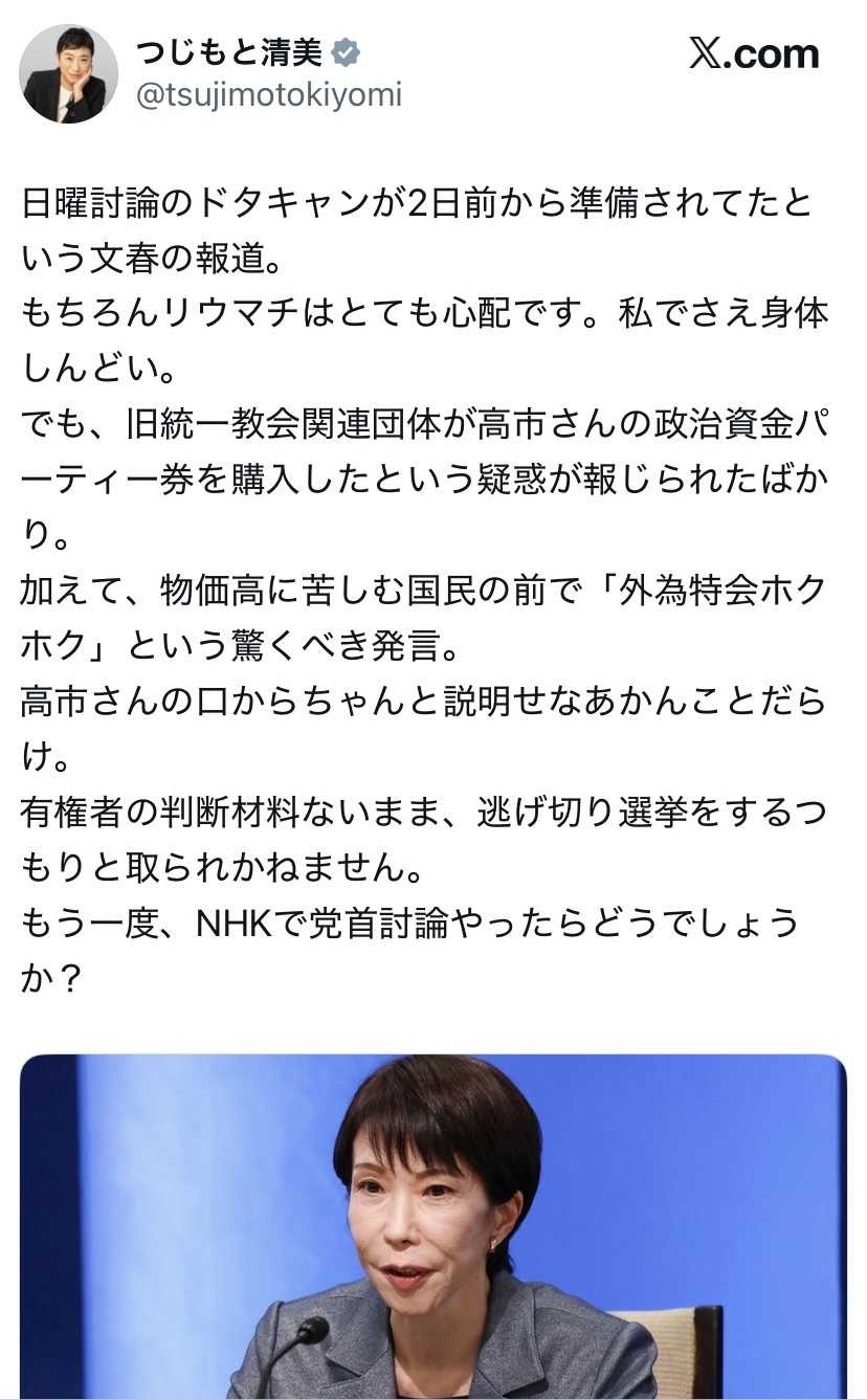 統一教会系団体のパーティー券購入疑惑は心配だが、高市さんのリウマチは説明すべき