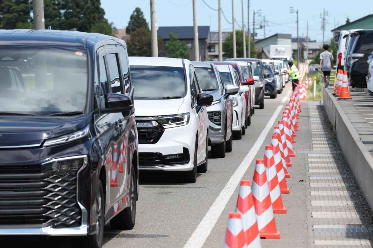 長岡まつり大花火大会の初日となった2日、長岡市喜多町の道の駅「ながおか花火館」では、朝から駐車場の満車状態が続き、駐車待ちの車列ができた。花火観覧を目的に訪れたドライバーが、1日夜から2日朝にかけて駐車したままであることが原因とみられる。強制的に退去させることはできず、花火館は対応に頭を悩ませている。