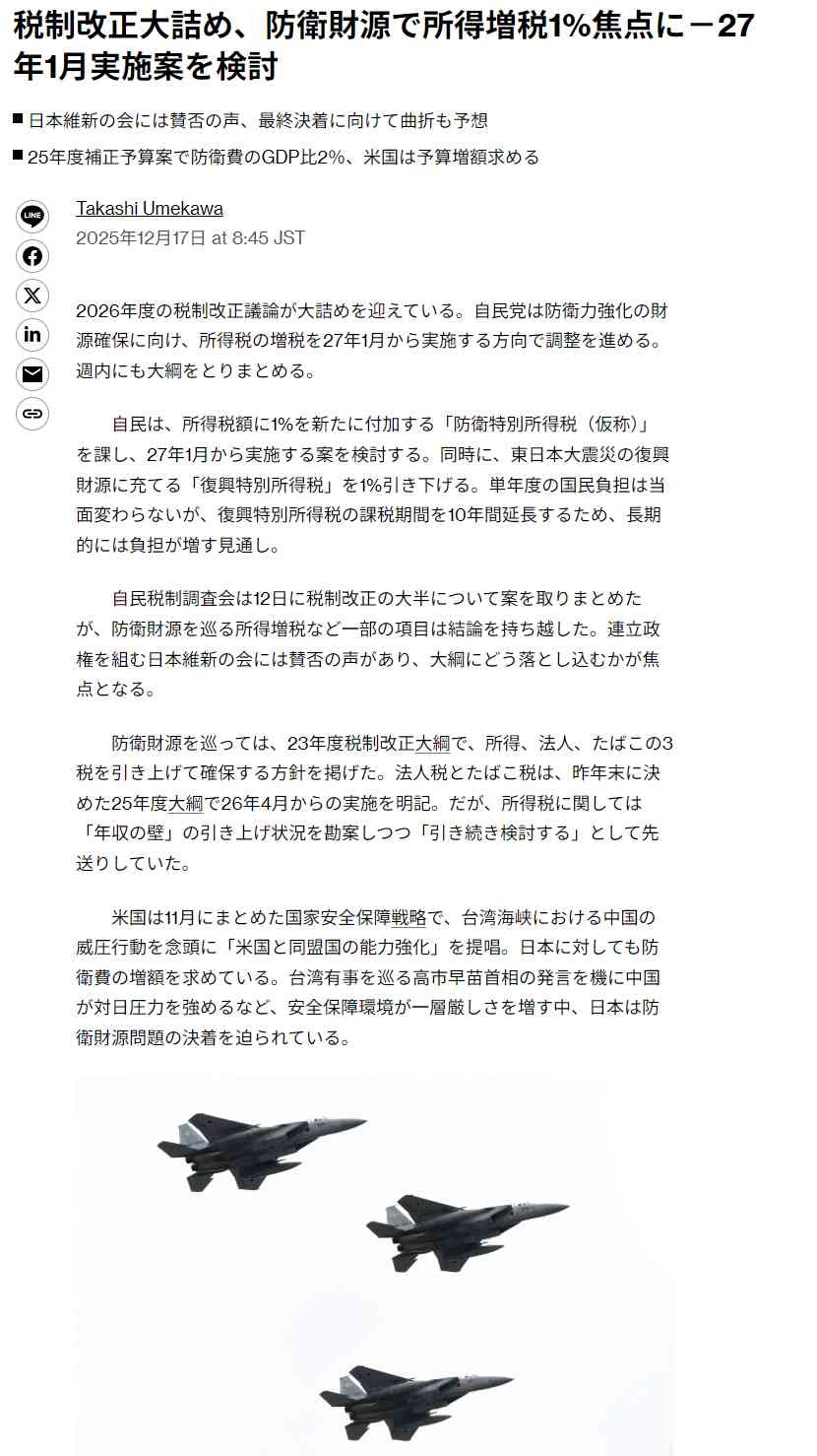 防衛財源で所得増税1%、中国と準戦時体制へ
