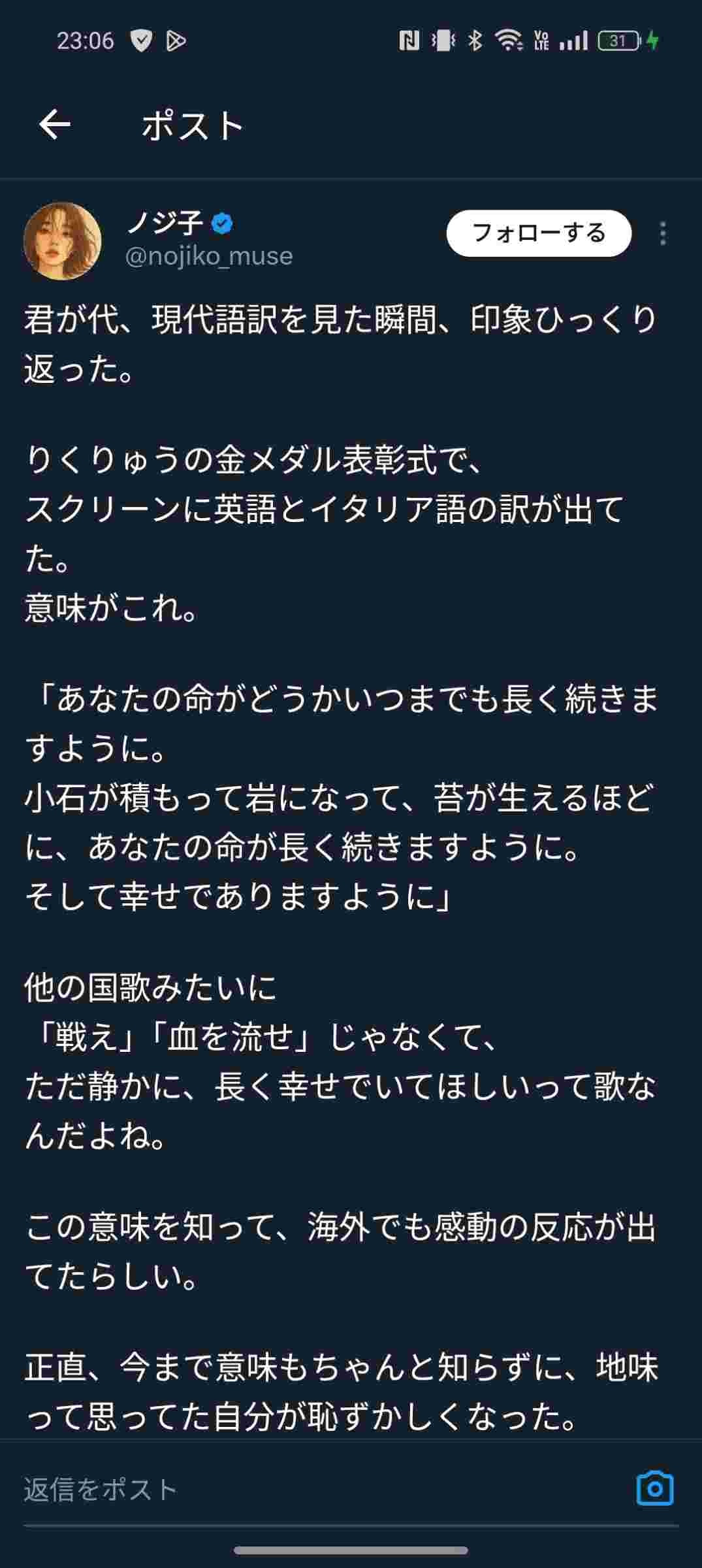 君が代、現代語訳を見た瞬間、印象ひっくり返った。 りくりゅうの金メダル表彰式で、 スクリーンに英語とイタリア語の訳が出てた。 意味がこれ。 「あなたの命がどうかいつまでも長く続きますように。 小石が積もって岩になって、苔が生えるほどに、あなたの命が長く続きますように。