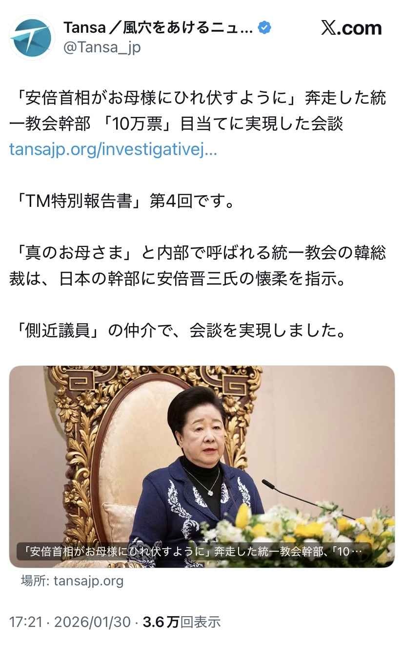 韓鶴子、安倍晋三の懐柔を日本の幹部に指示。統一教会のTM文書にて発覚
