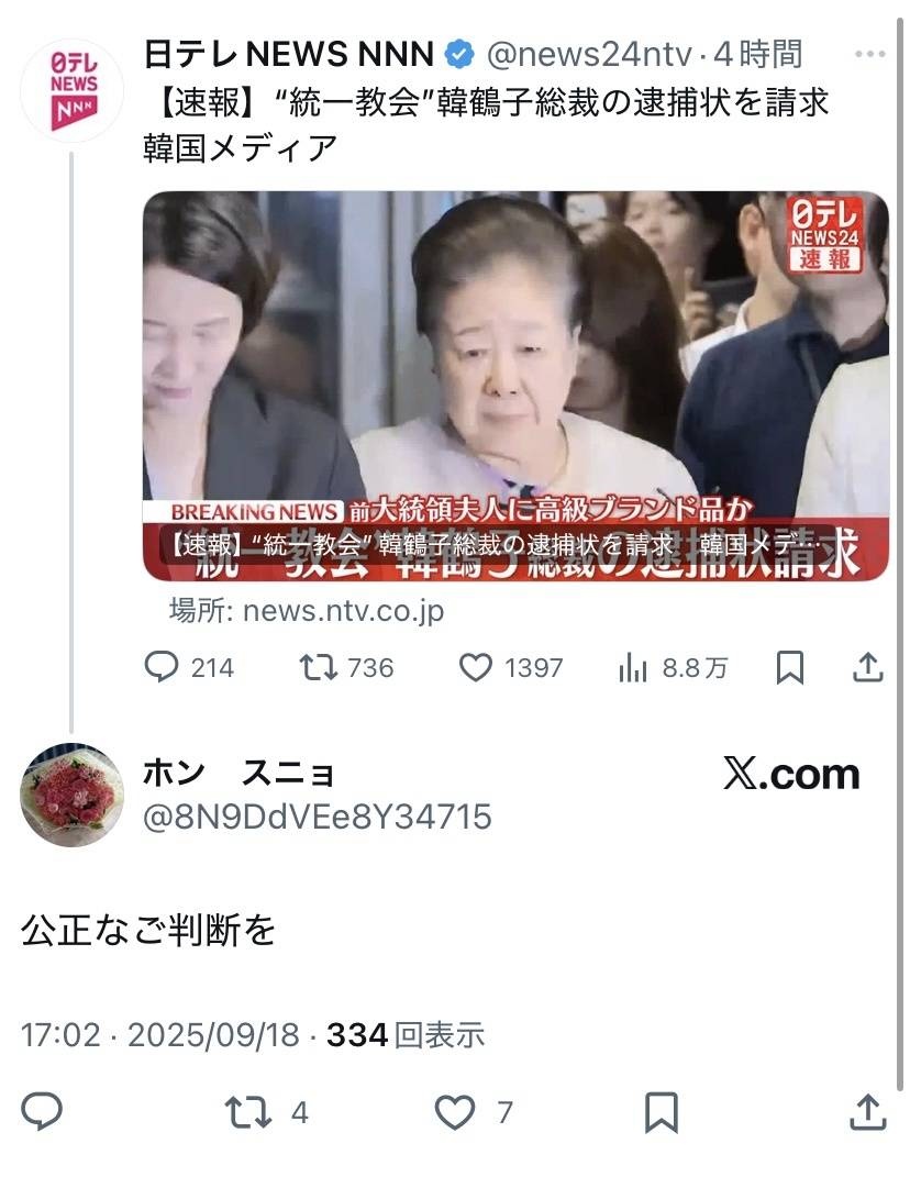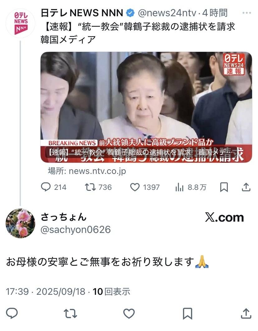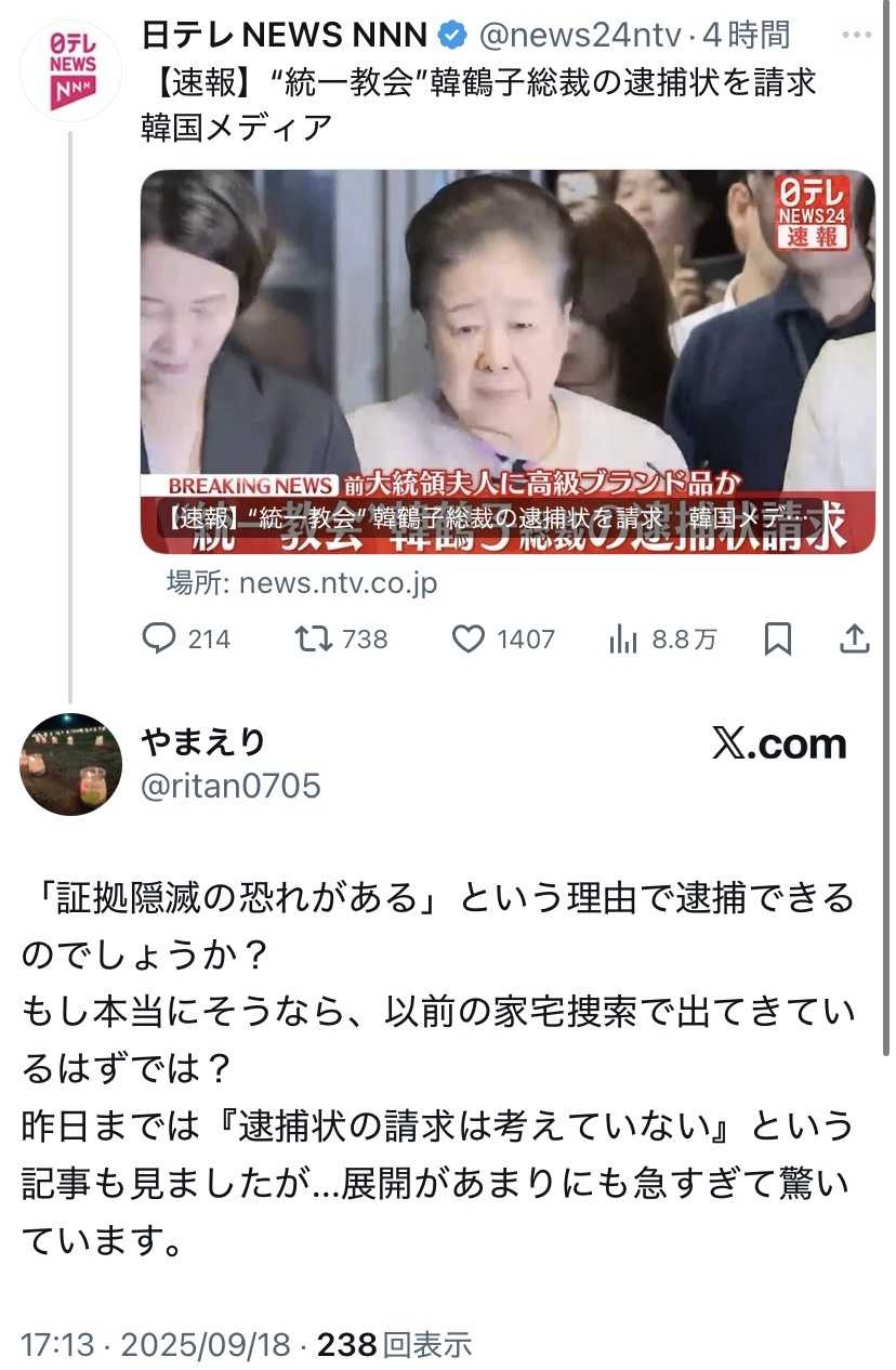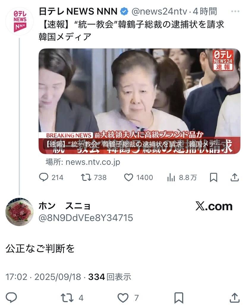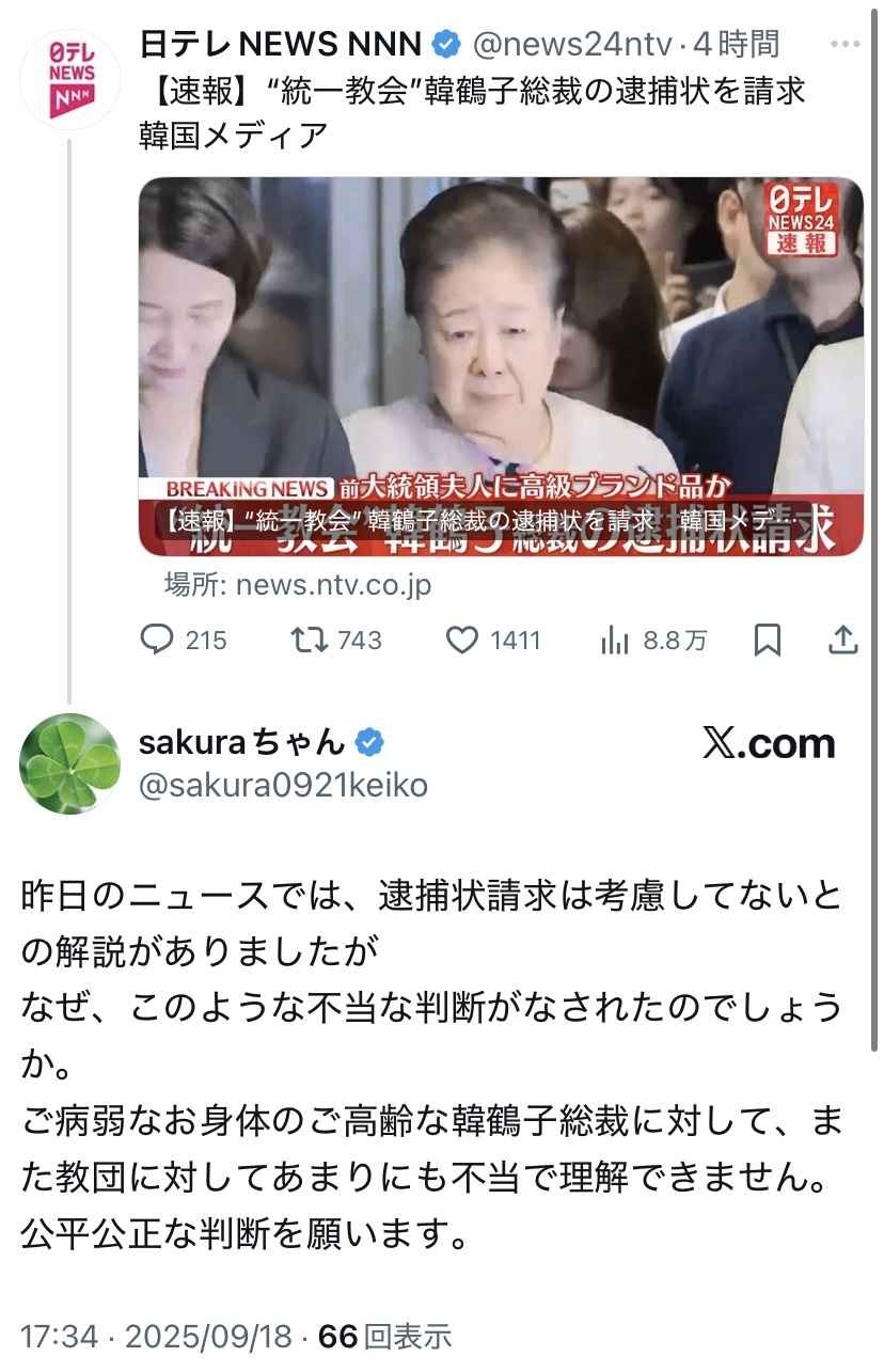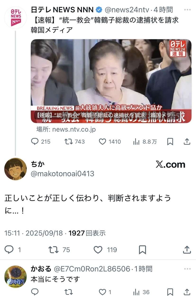 韓鶴子逮捕状請求の報道を受け信者が発狂中www
