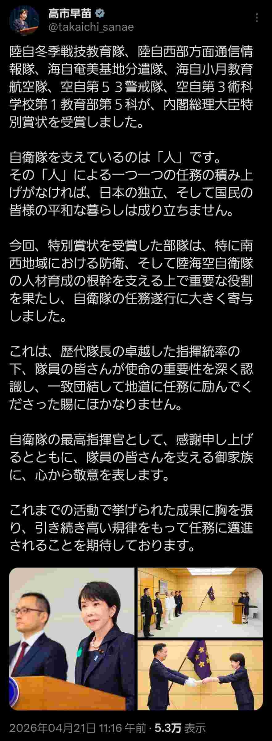 高市、つい先ほど自衛隊の件でポスト投稿😳