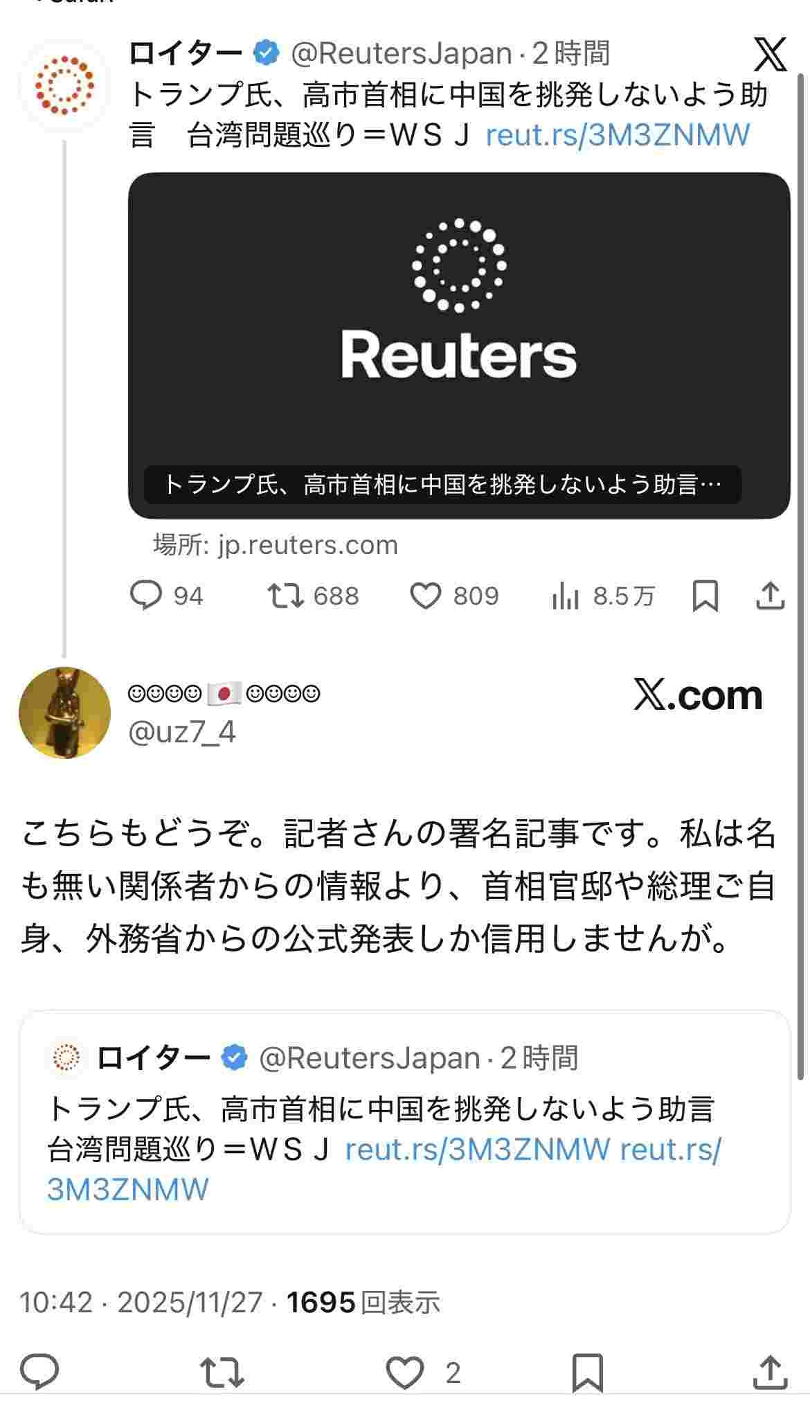 https://x.com/uz7_4/status/1993858008523350055高市総理は会見で外交に関わる事なのでと詳細は差し控えたはず。それを事実漏らしたのか、夢で見たのかは知りませんが、関係筋って誰ですか。元朝日新聞の記者さんの署名記事。