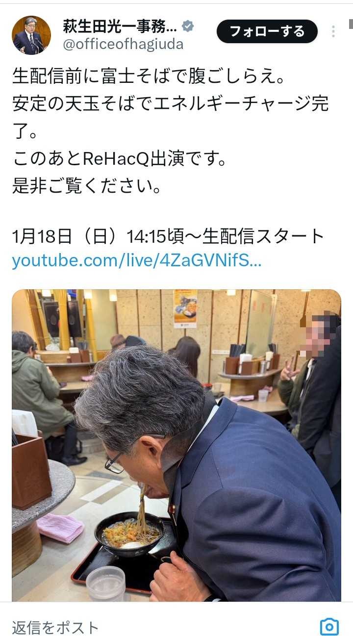 裏金脱税王ハギューダは黒エプロン付けて富士そば食べて庶民派アピールして準備整えてるからセーフや - 46 : 2026/01/26(月) 18:58:53.016 ID:0//P9iWOO