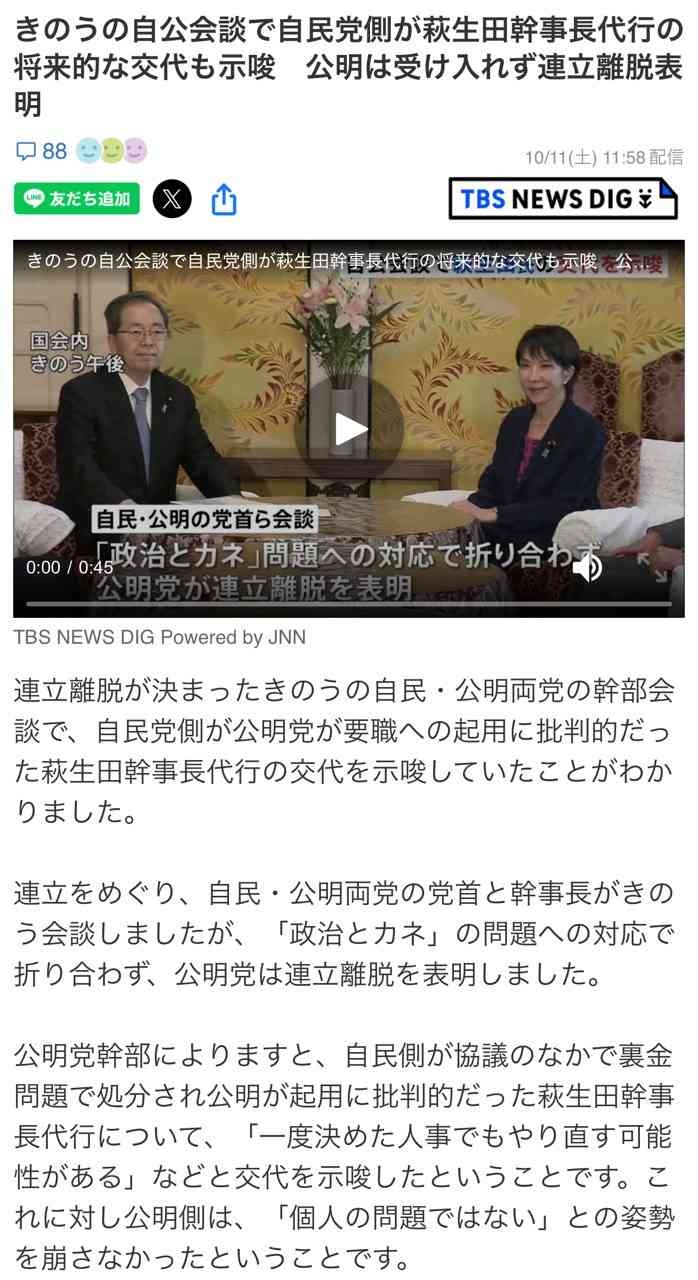 高市早苗「すみませんでした。萩生田の登用はやめますから連立解消はしないで下さい」公明党「もう遅い😡」