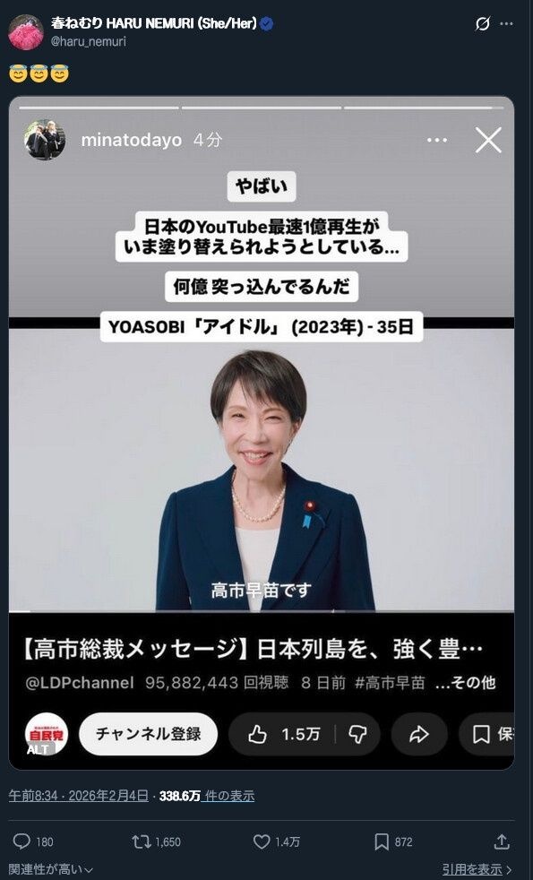 高市早苗さん、史上初のYouTube最速1億再生を達成!!!米津玄師やYOASOBIを超えてしまうwww