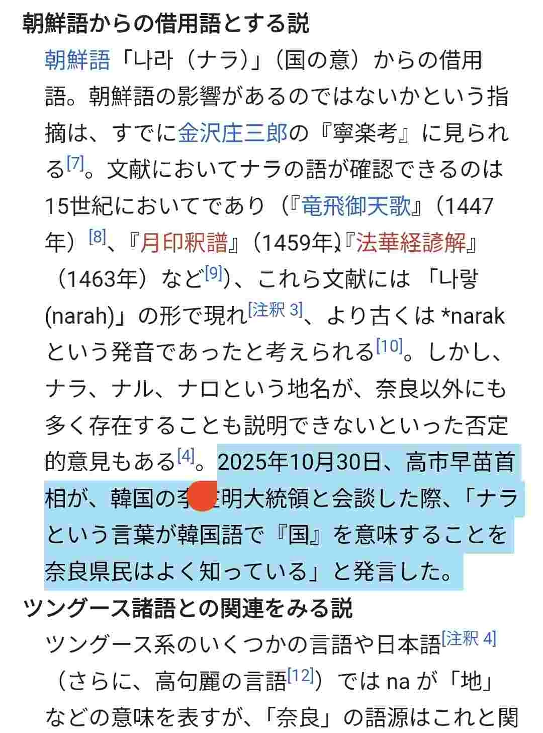 高市首相「ナラという言葉が韓国語で『国』を意味することを奈良県民はよく知っている」