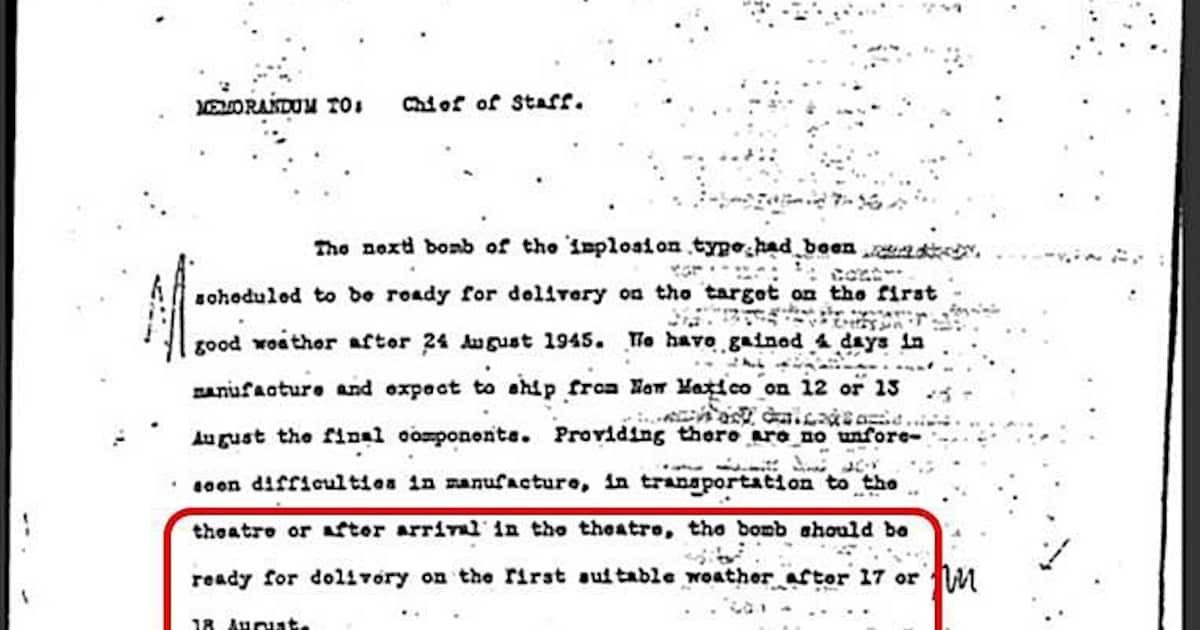 8月14日 トルーマン大統領と会談した駐ワシントン英国公使から英国外務省への電文報告(英国国立公文書館保管)によると、トルーマン大統領は、3発目の原爆の東京への投下を命令する以外に選択肢はないと述べた。
