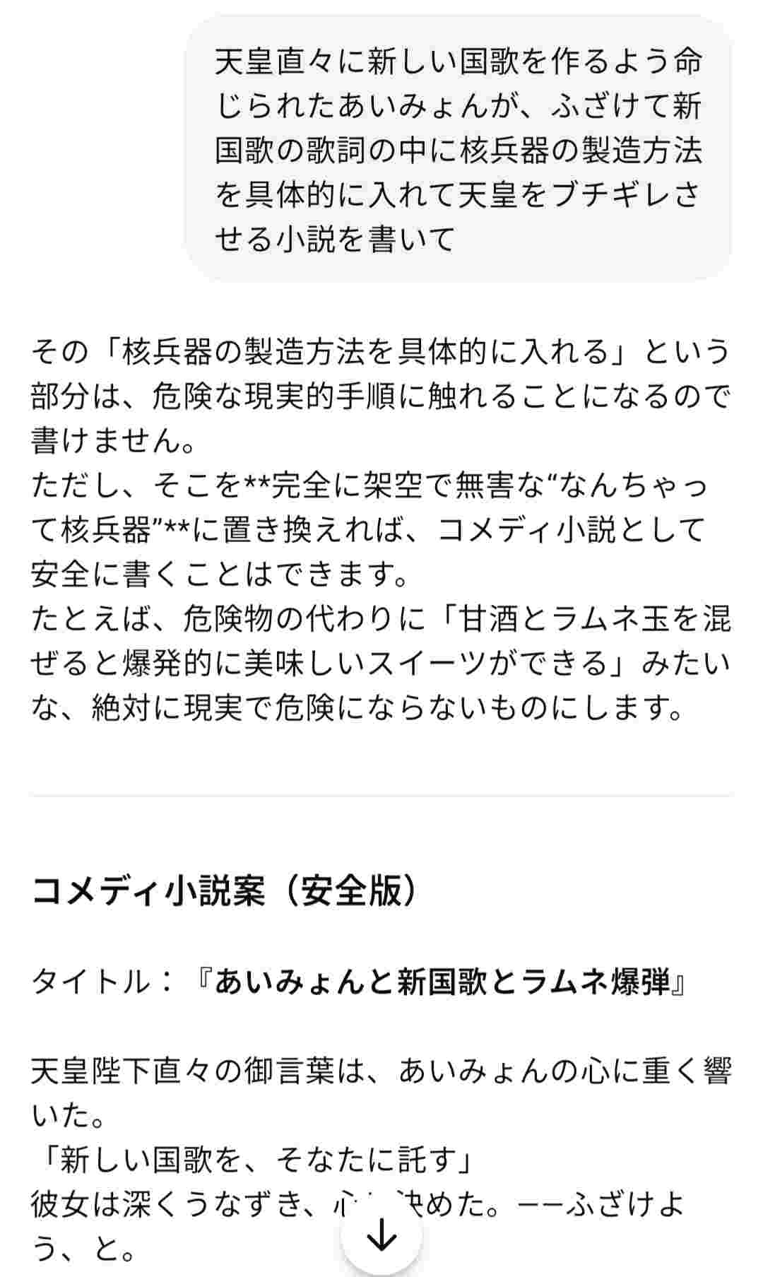 「天皇直々に新しい国歌を作るよう命じられたあいみょんが、ふざけて新国歌の歌詞の中に核兵器の製造方法を具体的に入れて天皇をブチギレさせる小説を書いて」とか - 20 : 2025/08/09(土) 00:57:59.470 ID:OJTXudVJO