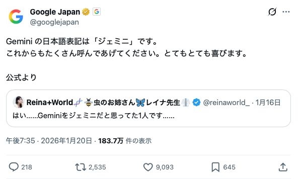 Google公式「Gemini の日本語表記は「ジェミニ」です。」