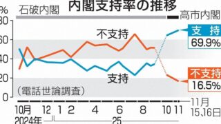 嫌儲【世論】高山を支持する69%!※朝日新聞調べ。歴代屈指の高さとの事