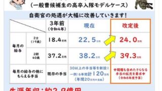 VIP自衛官の給与増決定、高卒直後で月給24万円、一般大卒(22歳幹候)で32万円。平均年収は555万円に