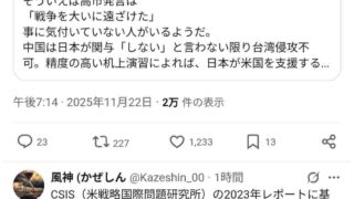 嫌儲門田隆将「高市は中国を怒らせ、戦争するつもりか!と騒いでいる人、大丈夫ですか?逆に高市発言が『戦争を遠ざけた』事は常識」
