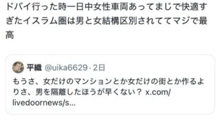 嫌儲X民「ドバイ行った時一日中女性車両あってまじで快適すぎたイスラム圏は男と女結構区別されててマジで最高」