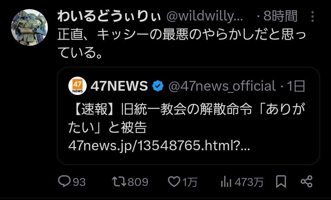 X「統一教会解散は岸田最悪のやらかし」←1万いいね