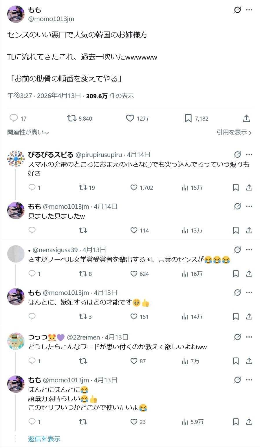 やっぱ韓国って暗黒微笑とか冷笑だと認定される文化がなさすぎてこういう銀魂系が蔓延ってるんかな - 33 : 2026/04/15(水) 06:10:53.988 ID:MVWc7LOtM