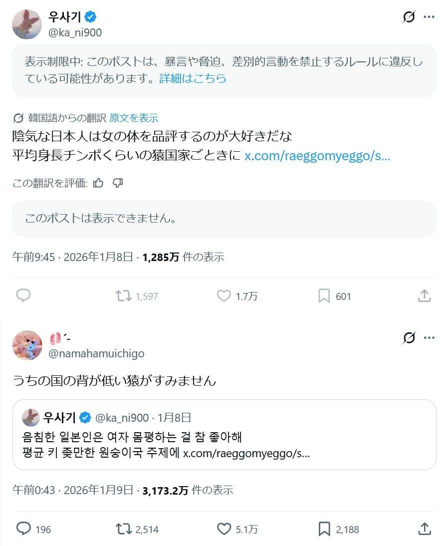 - おぱーいの位置おかしいこと指摘されて発狂した韓国女も4ねブス男皆殺しにしろみたいなレベルの内容で絶賛されてたしな