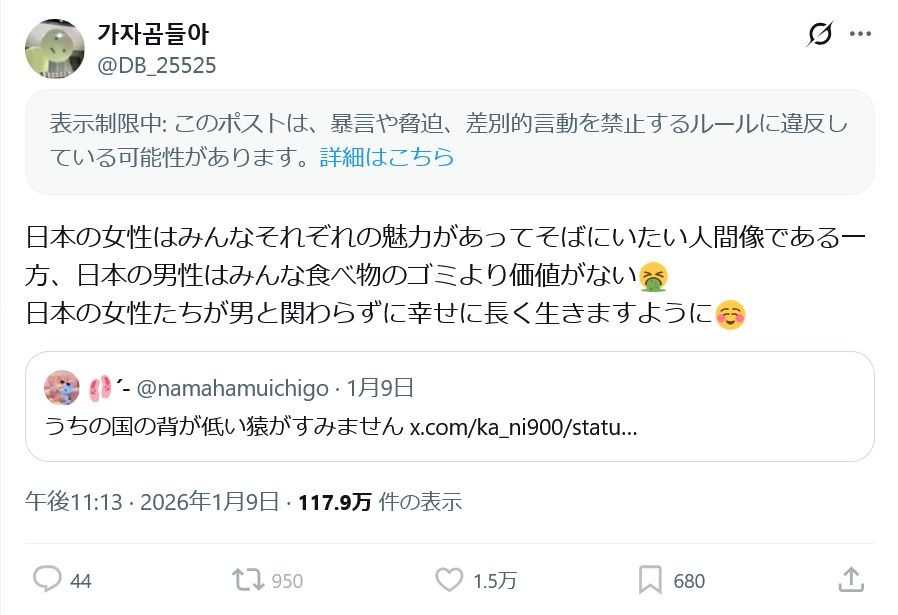 - Xの韓国人ってフェミ女はとてつもない数にいるけどアンフェミ男は全く見ないのはなんでなんや