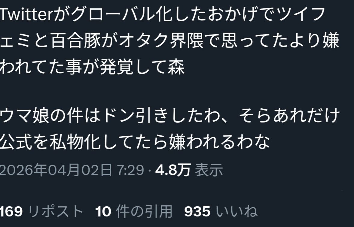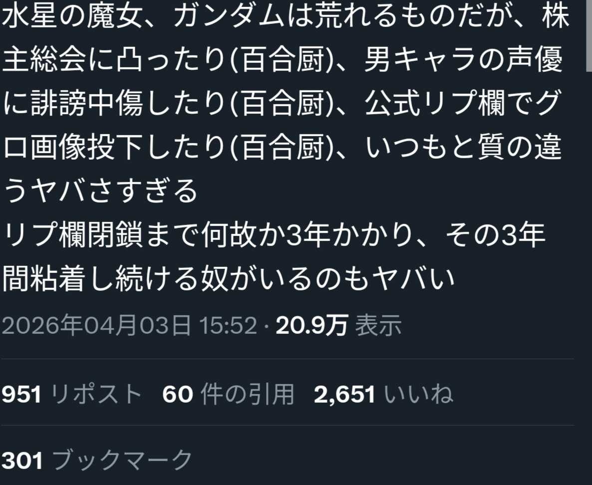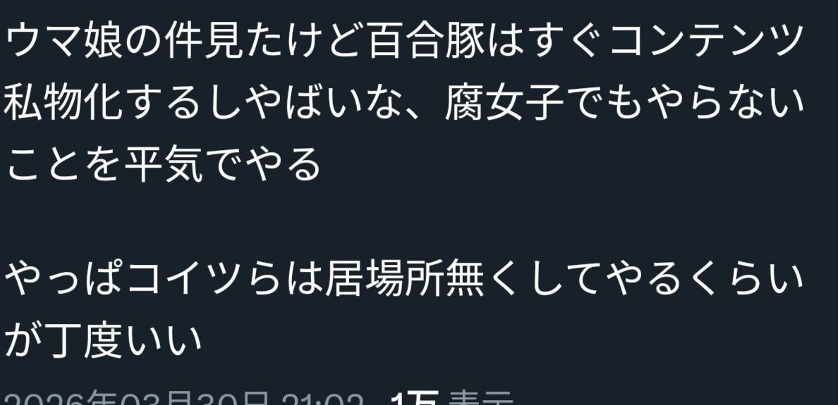 まあ百合好きもアンチもお互いエコチェンしまくってるからか? - 20 : 2026/04/18(土) 09:48:28.763 ID:MA61i77h7
