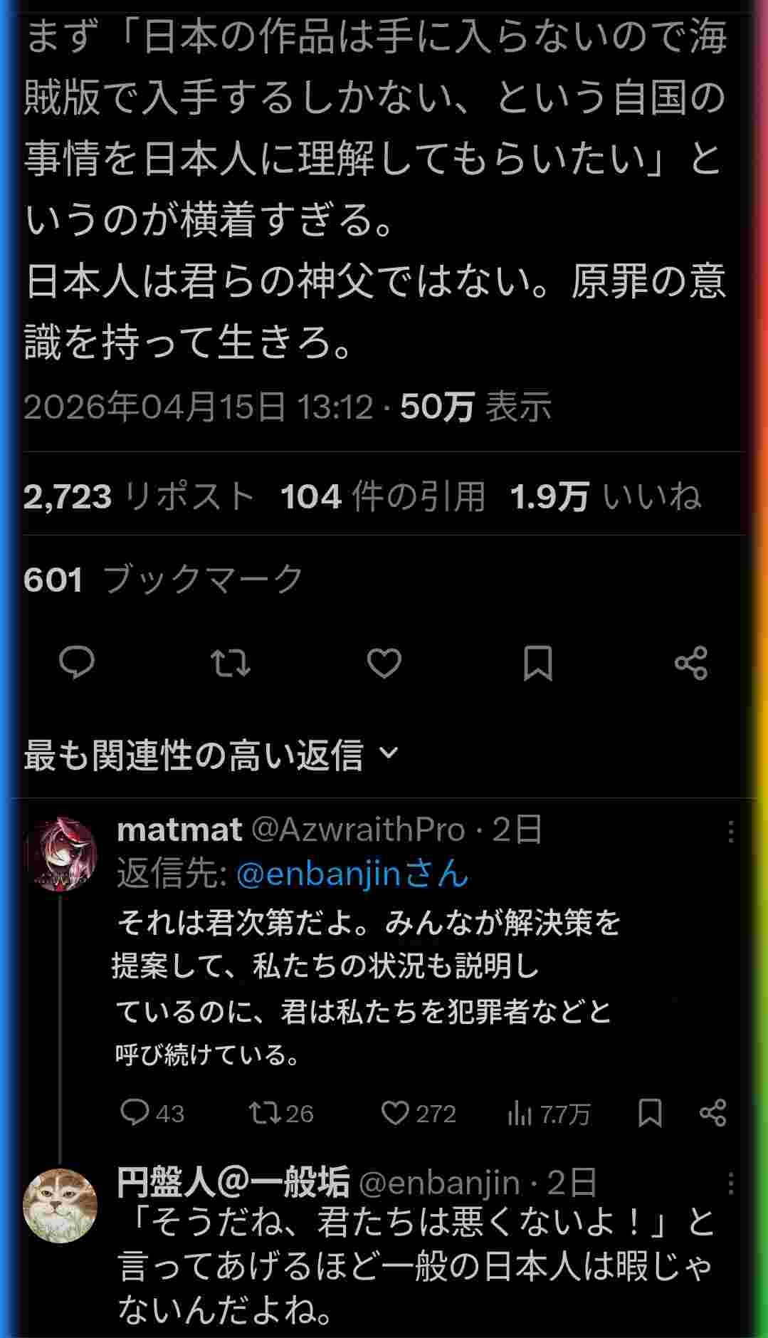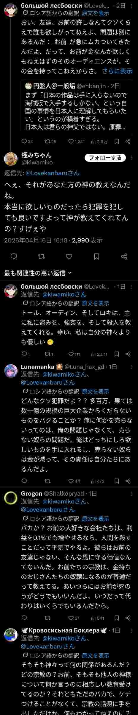 ただ自動翻訳実装後に日本人が汎ゆる国に喧嘩売りまくってるから「日本人ってこんなにヤバかったん?」って外人のポストがめっちゃ増えてる - 33 : 2026/04/18(土) 00:59:04.790 ID:XT/dGc1v6