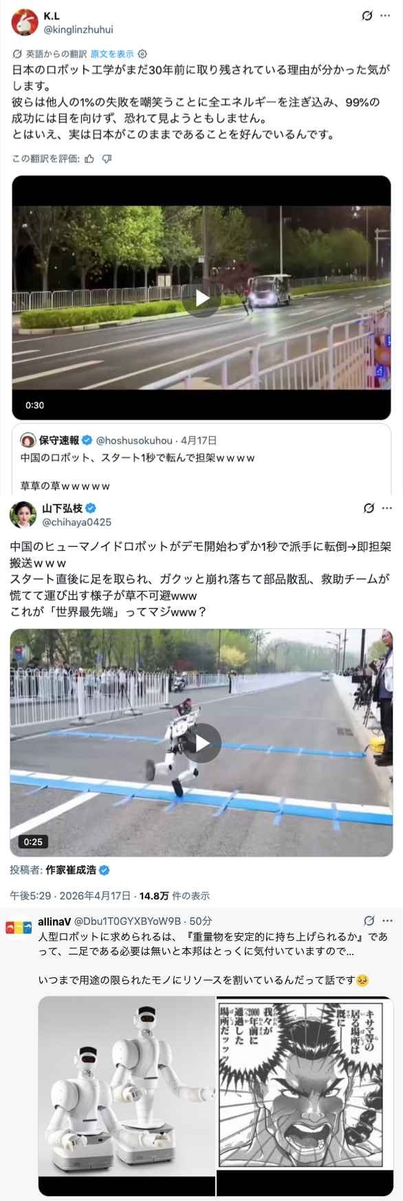 中国の二足歩行ロボットが転んだことはあざ笑うのに