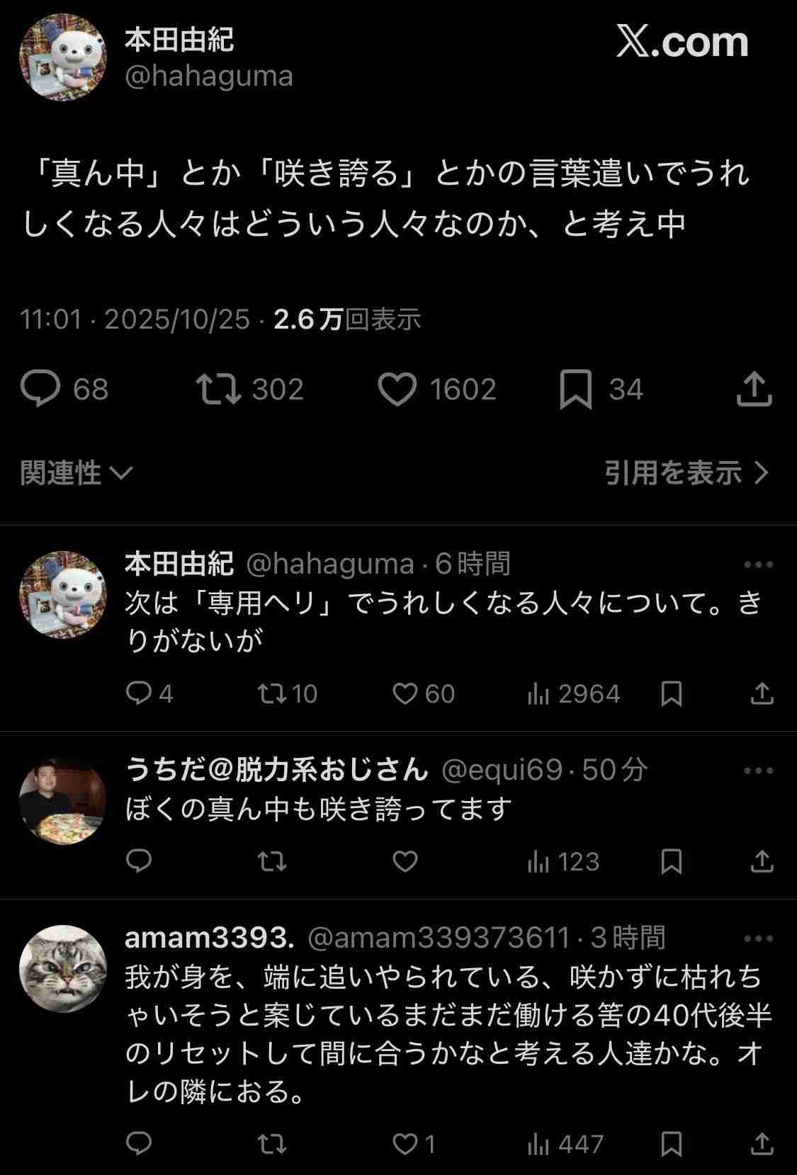 X民「真ん中とか咲き誇るとかの言葉遣いで嬉しくなるのはどんな人なの?」👈なんて答える
